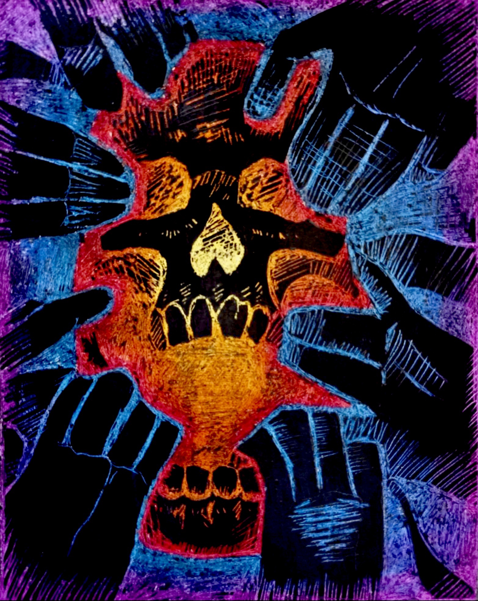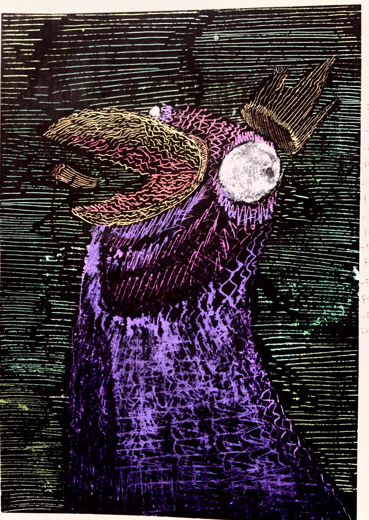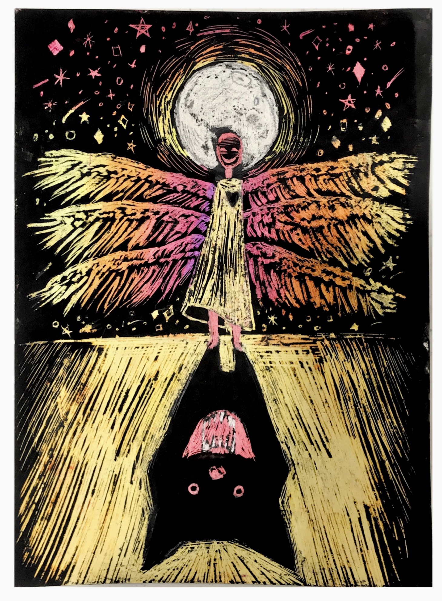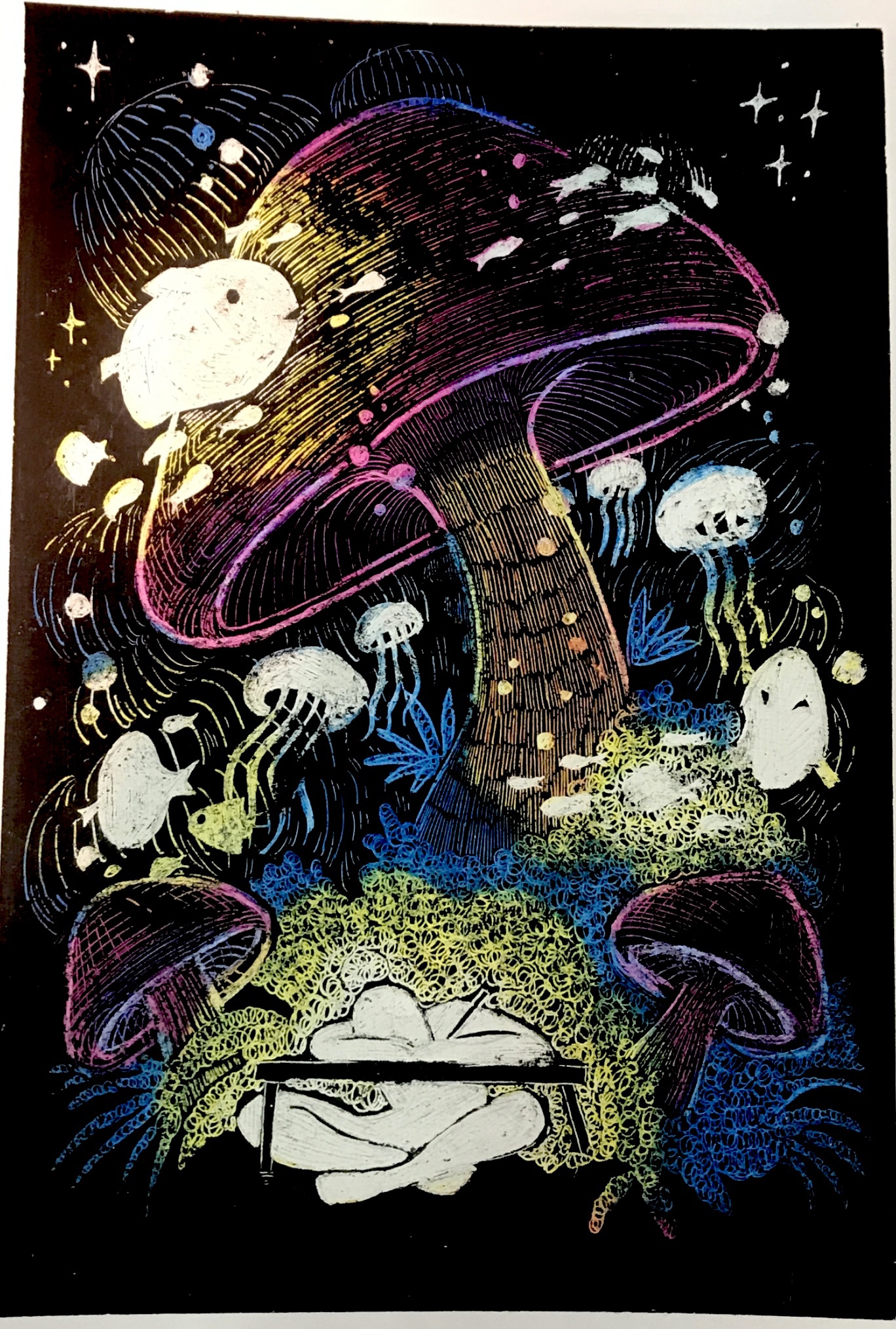Una ves hayas diseñado la ilustración, planifícala: Debes de tener en cuenta los colores que van en cada sección, si emplead difuminados en las zonas coloreadas, y dónde irán los elementos. Para ello puedes utilizar un folio como molde o plantilla matriz, para delimitar los contornos de esa figura y una vez tengas todo cubierto de negro, usarlo y no perderte.