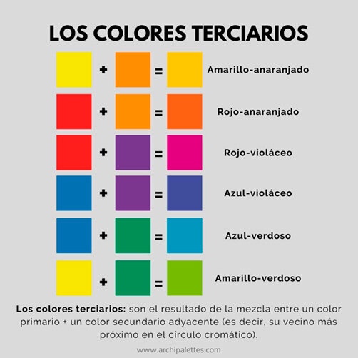 Continuando con este proceso de sucesivas mezclas aparece el término de los colores terciarios, que sería la mezcla entre el color secundario y uno de los primarios que hayas utilizado, desestabilizando la balanza en equilibrio cromático hacia uno de los primarios que componen ese color secundario: