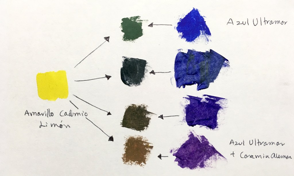 Antes de comenzar debes de saber que la mezcla de los tres colores pigmento da un marrón intenso muy oscuro, casi negro.