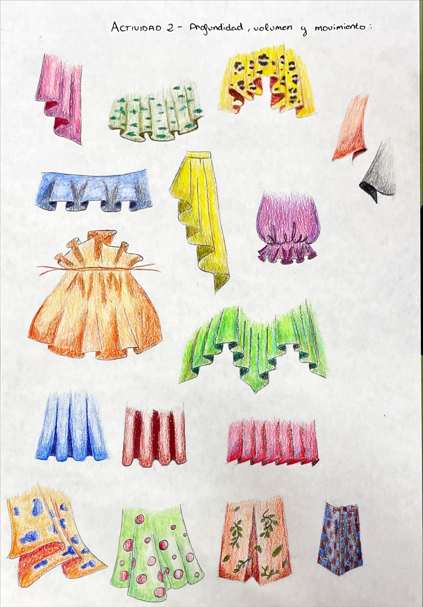 - Realiza un estudio volumétrico del tejido en diferentes posiciones en el cuaderno de campo: pliegues, plisados, volantes, fruncidos, abullonados…