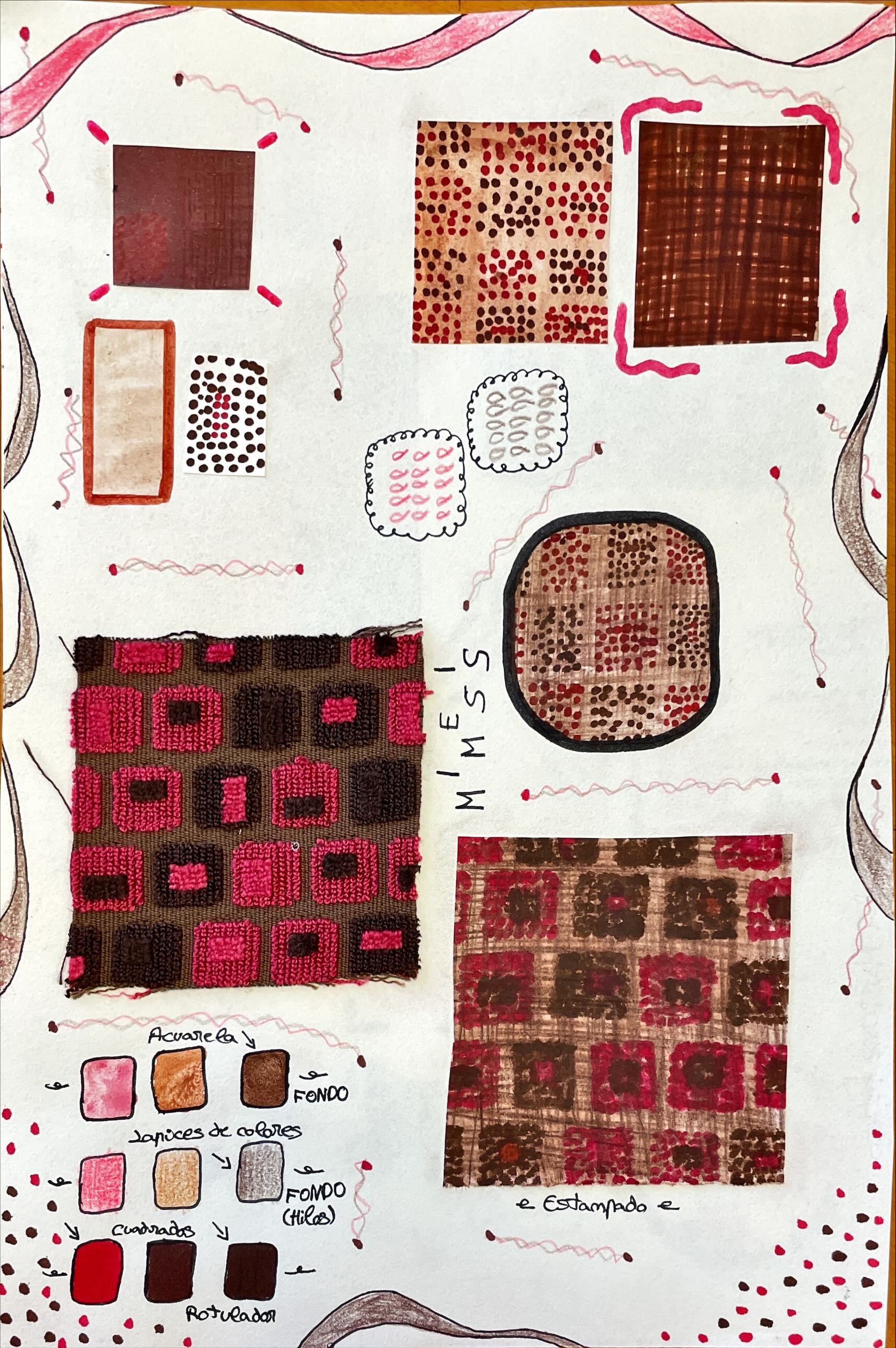 Realiza, con técnica mixta, un bloc informativo de una prenda y reproduce fielmente 3 muestras de tejidos.