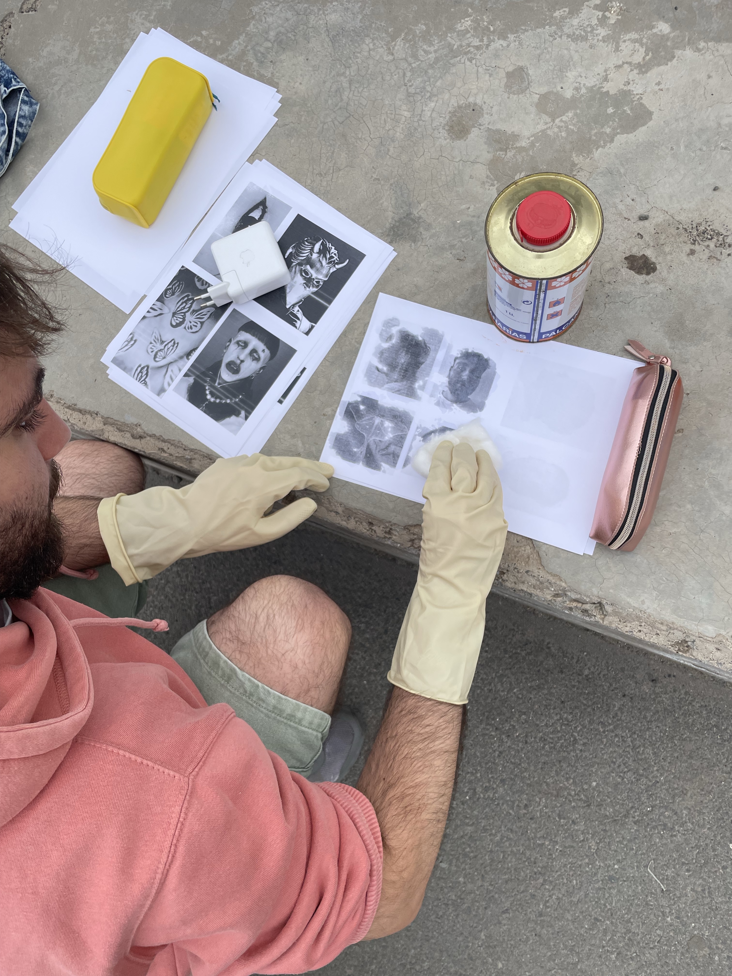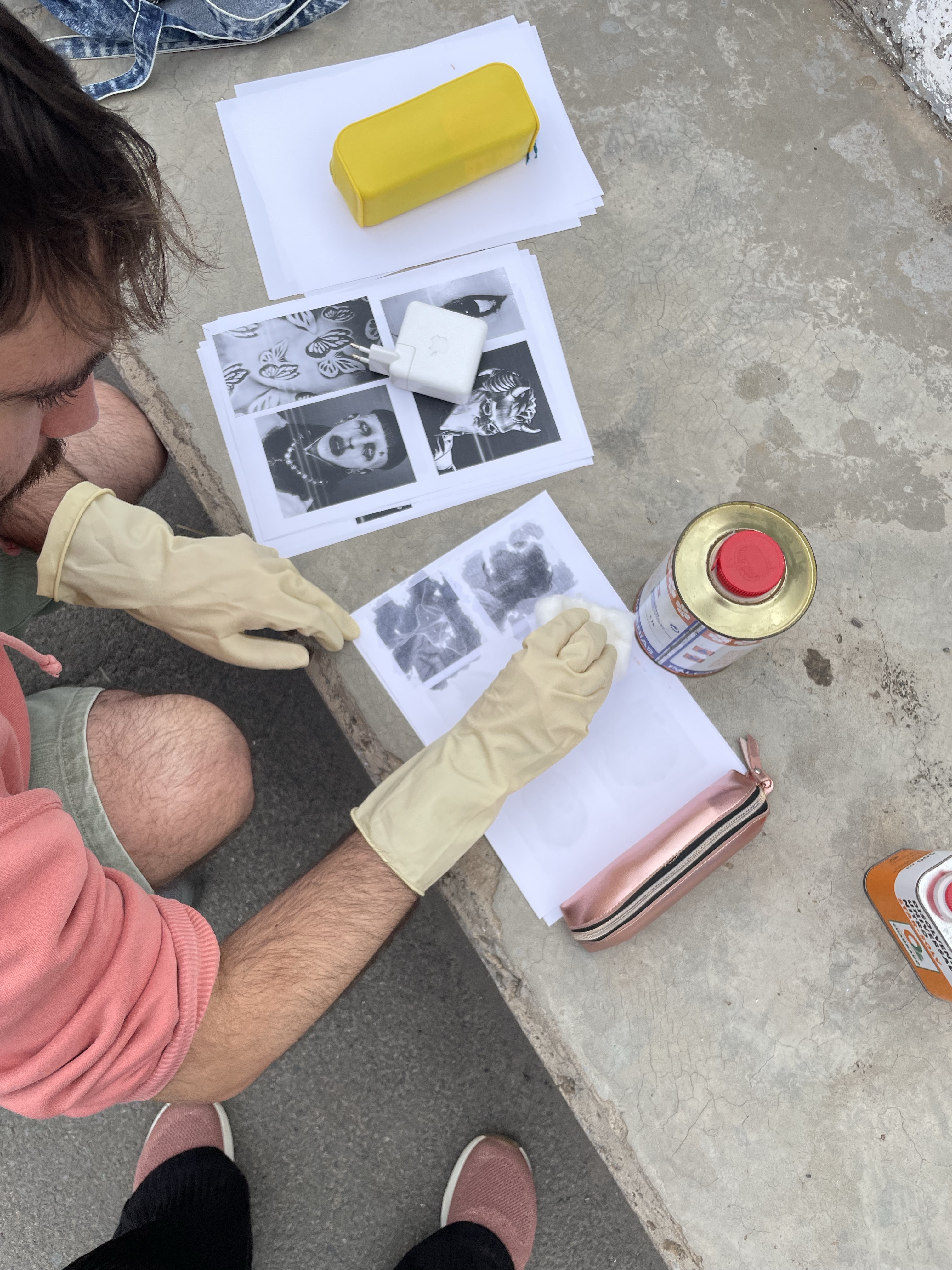 Otro modo de realización, es pincelar la imagen con el solvente y luego ejercer presión en forma uniforme, con un instrumento de punta roma