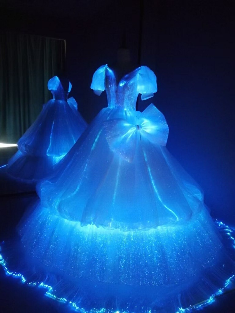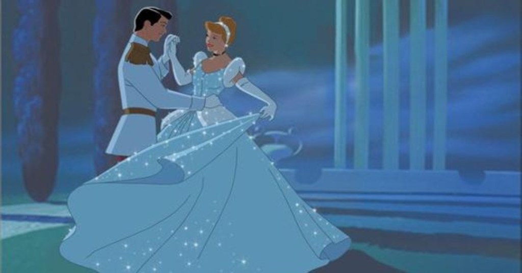 En la película de Disney de 1950 “La Cenicienta” , durante el baile en el que se enamoran ella y el príncipe su vestido brilla, con la magia del hada madrina.