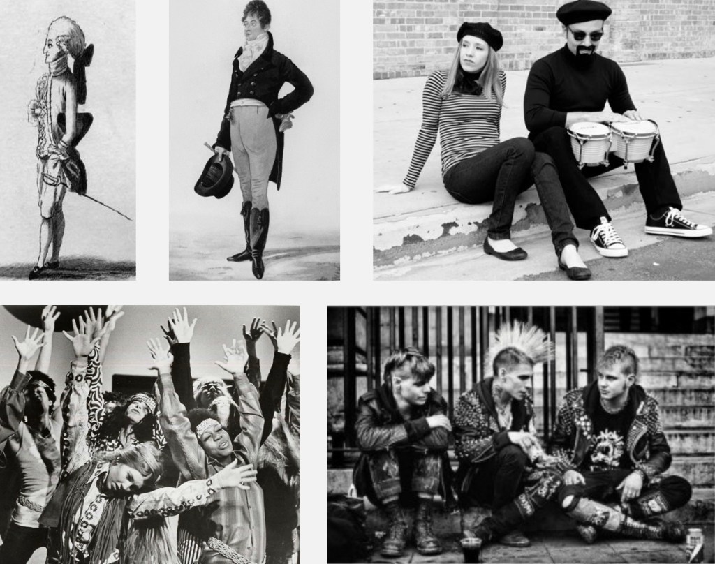 Macaronis: Fue la primera tribu urbana identificada. Eran individuos estrafalarios que llamaban la atención a mediados del siglo XVIII. Sus prendas eran coloristas y profundamente adornadas.