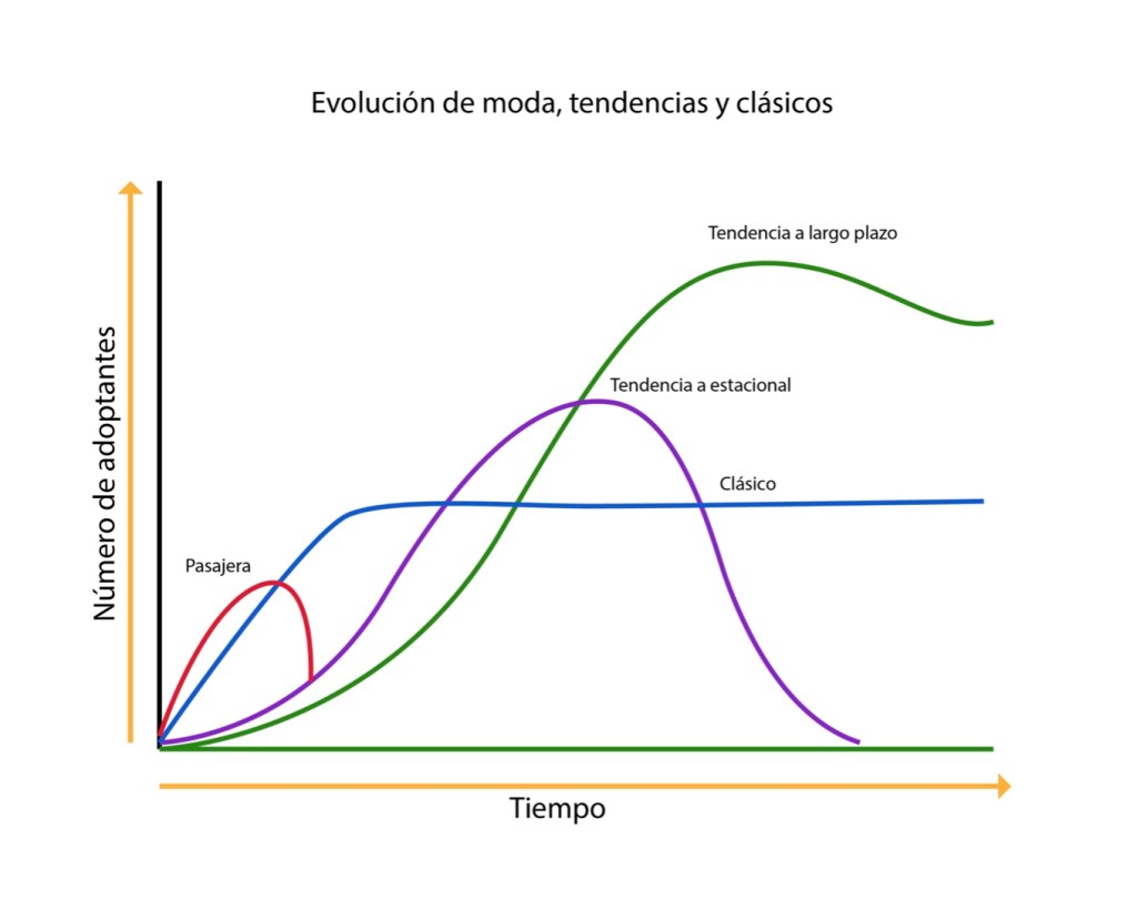 Al mismo tiempo, hay un ciclo de adaptación al producto que, en el caso de la moda, resulta fundamental para definir dónde está la tendencia, cuándo comienza y el momento en el que deja de considerarse tendencia.