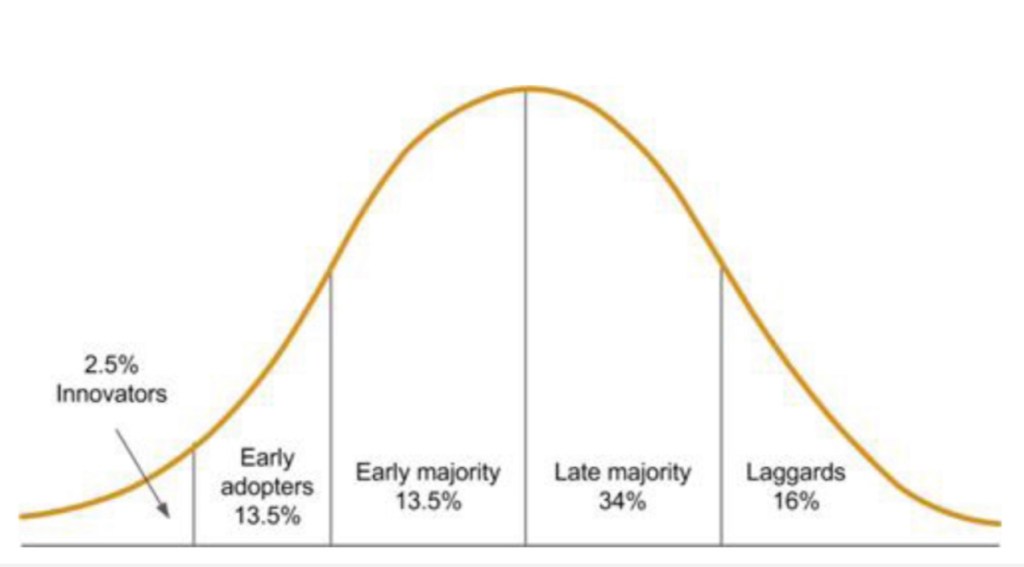- Late majority o mayoría tardía (34%) Se trata de ese grupo de personas escépticas y con miedo al cambio,que aceptan la tendencia únicamente cuando la han visto ya en los armarios y escaparates de la gran mayoría. La tendencia se masifica y hacia la mitad de la curva de este bloque su uso comienza a decrecer.